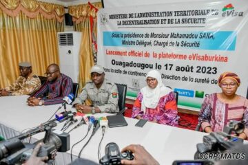 Au cours d’une conférence de presse organisée le 17 août 2023, à Ouagadougou, le ministre délégué, chargé de la Sécurité, le Commissaire Principal de Police, Mahamadou Sana a procédé au lancement officiel de la Plateforme eVisa Burkina. Il avait à ses côtés d’autres membres du Gouvernement.