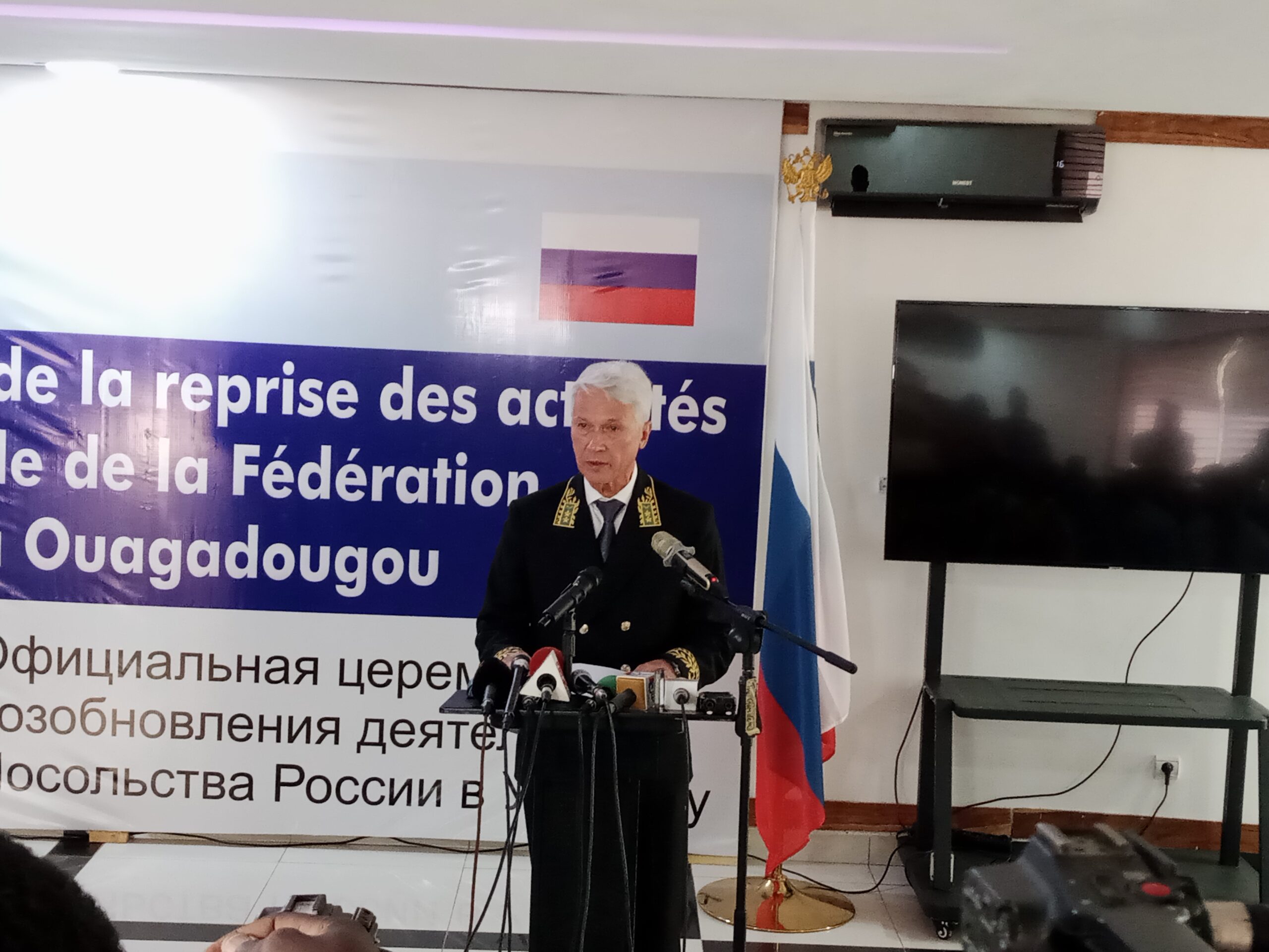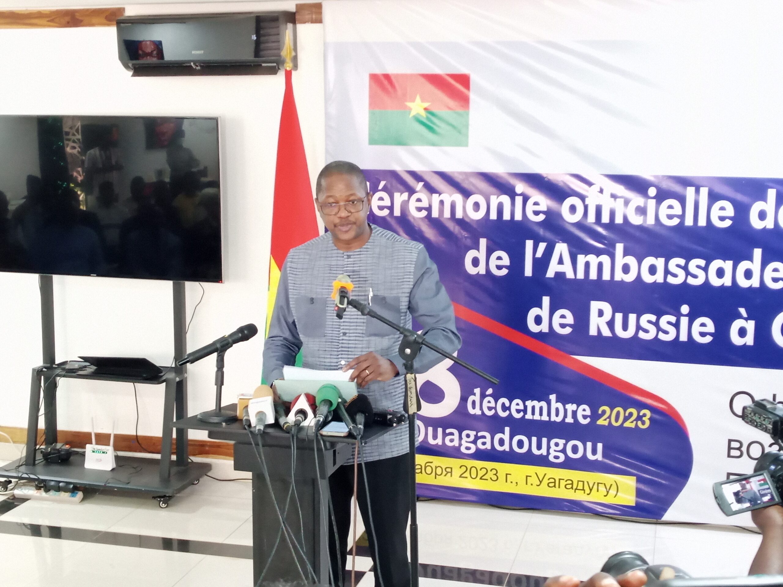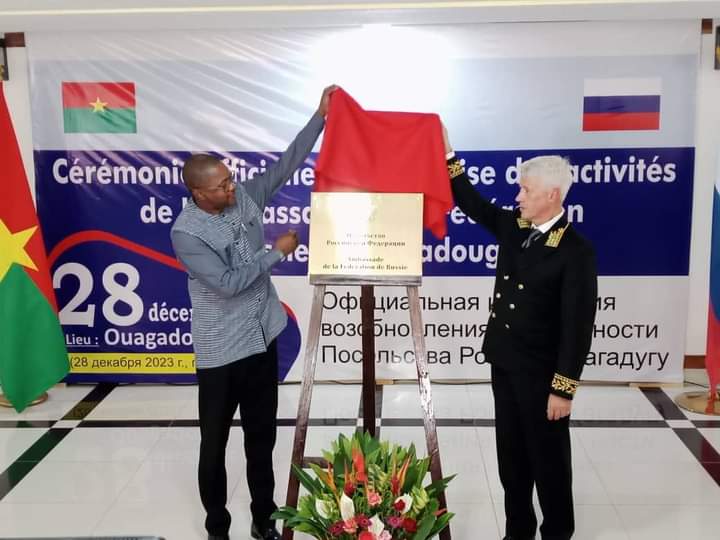 A l’occasion d’une cérémonie organisée le 28 décembre 2023 à Ouagadougou, l’ambassade de la Fédération de Russie a repris officiellement ses activités au Burkina Faso. Cette reprise intervient après plus de trois décennies de rupture de relations diplomatiques entre les deux pays. La cérémonie a connue la présence des membres du gouvernement burkinabè avec à leur tête le Premier ministre ainsi que l’ambassadeur russe et des corps diplomatiques.