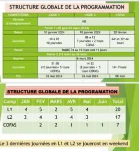 Au programme, La première partie va se jouer du 10 janvier 2024, jusqu’au 03 mars 2024. La deuxième partie va se dérouler du 16 mars au 26 mai 2024. Une pause du 4 au 15 mars sera effectué pour permettre aux joueurs de souffler. La fin des championnats nationaux est également fixée au 26 mai 2024 ainsi que la finale de la coupe du Faso le 08 juin 2024.