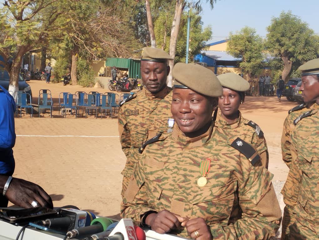 « Je suis très honorée ce matin parce que je viens de recevoir la médaille militaire, ceci montre que nous devons redoubler beaucoup d’efforts dans nos activités et dans nos missions. Je profite de l’occasion pour remercier toute ma hiérarchie pour cette reconnaissance. C’est aussi l’occasion pour moi de dédier cette médaille à toute les forces combattantes qui sont engagés sur le terrain pour la reconquête du territoire, et aussi à ma famille et à mes collaborateurs proches. Je voudrais aussi ici, traduire mes hommage à tout ceux qui nous ont quittés dans cette crise et aussi à mes défunts parents. Je souhaite également prompt rétablissement aux blessés et bon courage aux familles éplorés, à toutes les veuves et orphelins. Que Dieu bénisse le Burkina Faso », a martelé l’Adjudant Madina Nikiéma, en service à la Direction de la communication et des relations publiques au ministère en charge de la défense.