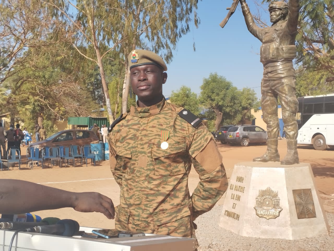 « J’ai reçu ce matin la médaille militaire. Je suis animé d’un sentiment d’honneur, de fierté et de joie. Je dédie en premier lieu cette médaille au commandement qui m’a témoigné sa satisfaction pour le travail abattu tout au long de mes 21 ans de service, en deuxième lieu aux camarades qui sont tombés sur le champs de bataille. En dernier lieu, à ma famille et mes amis qui me soutiennent au quotidien. Vivement que la paix revienne au Faso », a signifié, l’Adjudant chef Jean Sié, agent de l’escadron motocycliste d’intervention du Groupement de sécurité et d’intervention de la Gendarmerie.