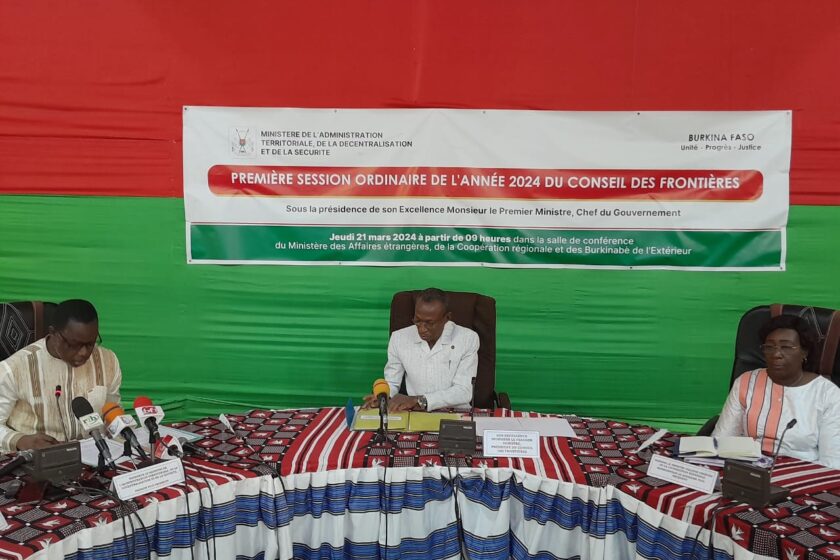 Le ministère de l’Administration Territoriale, de la Décentralisation et de la Sécurité (MATDS) a organisé le jeudi 21 mars 2024 à Ouagadougou, la première session ordinaire de l’année 2024 du Conseil des frontières. Elle était placée sous la présidence du Premier ministre, Joachimson Kyelem, par ailleurs président dudit conseil.