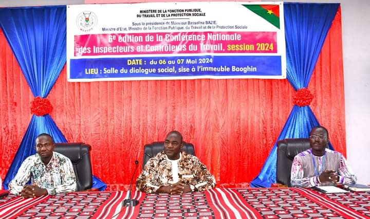 Le mardi 7 mai 2024 à Ouagadougou, le ministre d’Etat, ministre de la Fonction publique, du Travail et de la Protection sociale, Bassolma Bazié, a présidé la cérémonie de clôture des travaux de la 6e édition de la Conférence nationale des inspecteurs et contrôleurs du travail (CNICT).