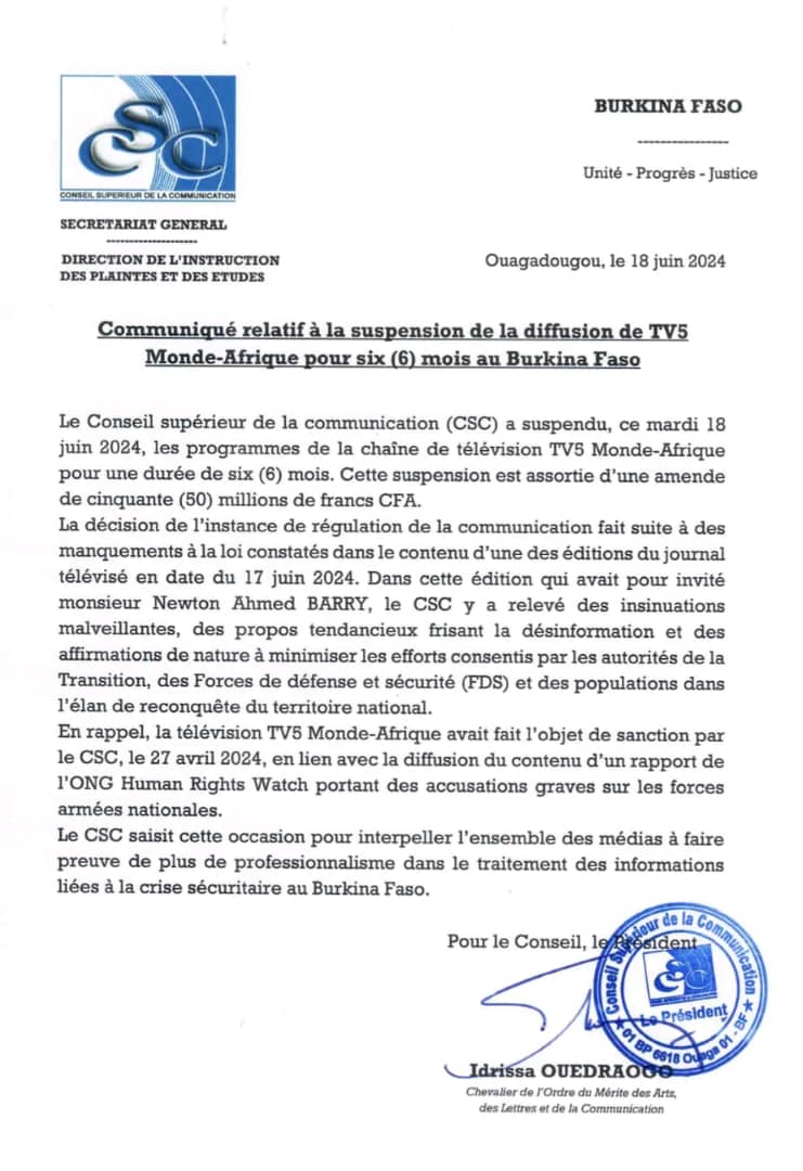 Dans un communiqué de presse en date de ce mardi 18 juin 2024 à Ouagadougou, le Conseil supérieur de la communication (CSC) a annoncé la suspension des programmes de la chaîne de télévision TV5 Monde-Afrique pour une durée de 06 mois. Cette suspension est assortie d’une amende de 50 millions de francs CFA.