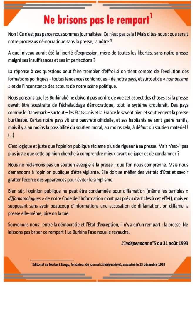 Notons que la lecture de l’éditorial « Ne brisons pas le rempart » de Norbert Zongo, publié le 31 août 1993, la présentation du rapport 2023 de la situation de la liberté de presse au Burkina Faso, la remise du rapport aux invités et partenaires, et l’animation de deux panels en lien avec le thème général, ont été les grandes lignes de cette célébration.