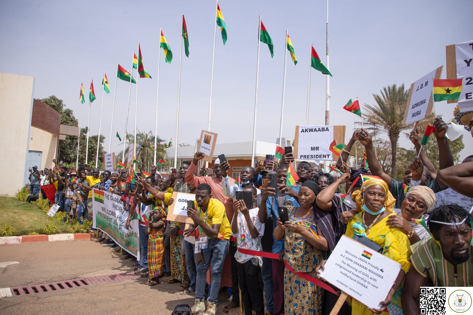 A sa descente d’avion, le président ghanéen a eu droit aux honneurs militaires. Il a également reçu des mains du Capitaine Ibrahim Traoré le traditionnel chapeau de Saponé avant d’être acclamé par la forte communauté ghanéenne vivant à Ouagadougou.