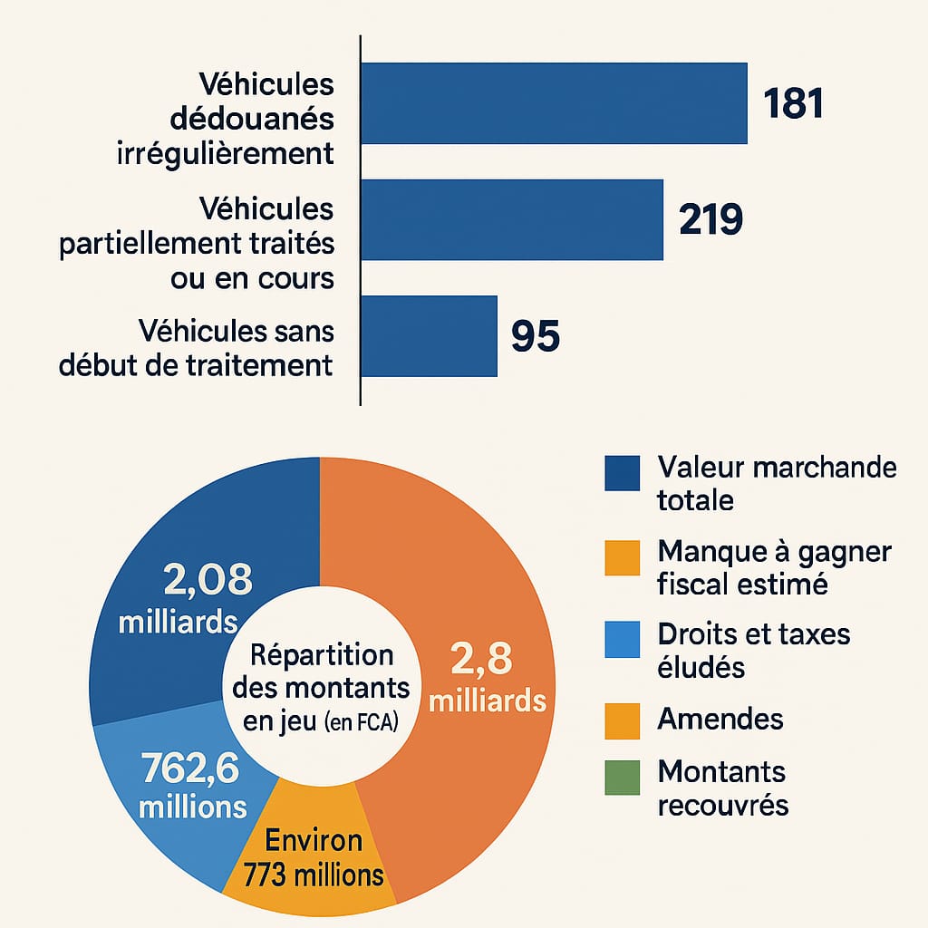 Au total, 181 véhicules ont été dédouanés de manière irrégulière à l’aide de seulement trois arrêtés d’agrément, représentant une valeur marchande de 2,08 milliards FCFA, avec un préjudice fiscal de 576,3 millions FCFA en droits et taxes éludés. Environ cinquante de ces véhicules ont pu être régularisés, générant 127 millions FCFA de droits complémentaires et 131,5 millions FCFA d’amendes.