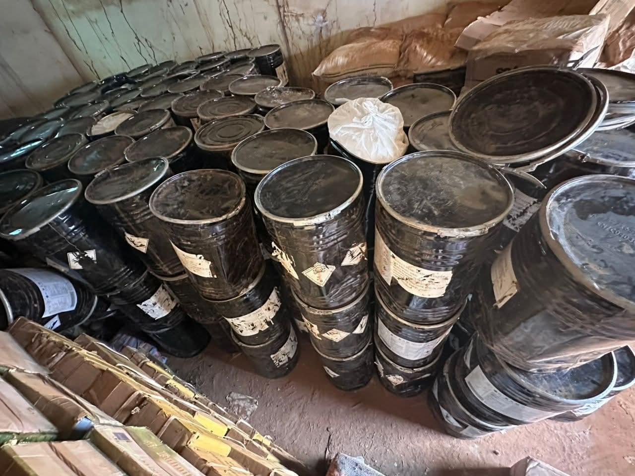 À la hauteur dudit véhicule, les agents ont découvert des sacs de 100 kg estampillés « Faso Boro » dissimulant en réalité 221 cartons de cigarettes de marque étrangère. Quelques pas plus loin, leur instinct les a conduits à un second véhicule, embourbé. En procédant à la fouille, ils ont révélé un chargement encore plus alarmant : 193 fûts de cyanure, une substance mortelle, auxquels s’ajoutaient 26 cartons d’amphétamines.