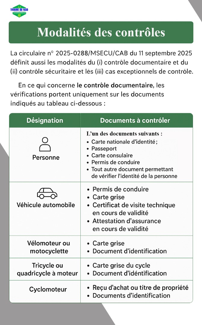 Le nouveau dispositif repose sur deux types de contrôle que sont, le contrôle documentaire et le contrôle sécuritaire. Le contrôle documentaire porte uniquement sur les documents administratifs des usagers de la route et ceux afférent à la conduite et la circulation des véhicules.