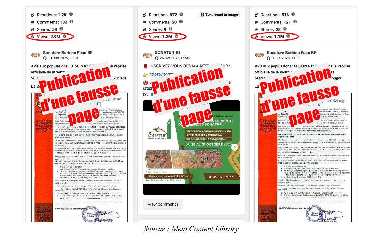 Parmi les contenus viraux liés aux activités de la SONATUR sur Facebook figure également une autre fausse page intitulée SONATUR-Bf. Cette fausse page compte plus de 8 800 abonnés. Le 25 octobre 2025, elle a publié un communiqué de la SONATUR avec un commentaire trompeur et manipulateur : « Inscrivez-vous dès maintenant… Les parcelles SONATURBf partent vite – ne ratez pas cette opportunité unique !« . Cette publication a touché plus de 1,3 millions de personnes sur Facebook.