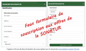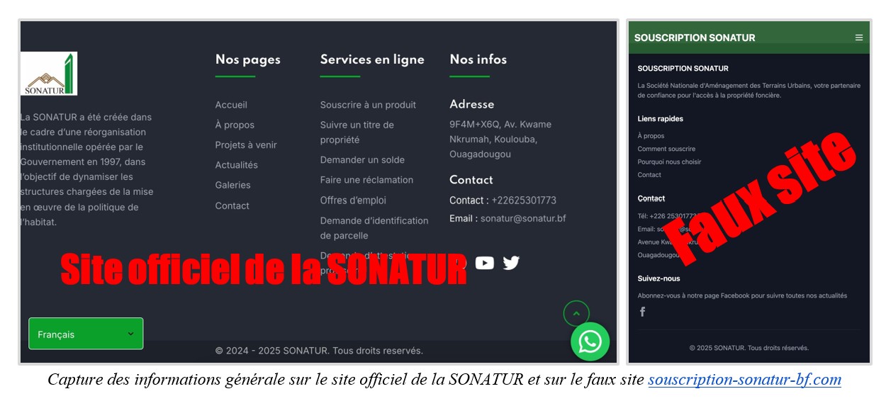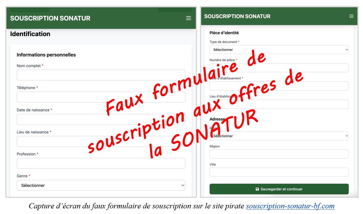La deuxième étape de l’escroquerie consiste à la mise en ligne de sites usurpateurs, dont les noms et la charte graphique s’inspirent du site officiel de la SONATUR. Parmi ces sites usurpateurs, les plus répandus sont : souscription-sonatur-bf.com, sonatursouscriptionbf.com ou encore souscription.sonaturbf.net. Grâce aux publications sponsorisées, les internautes sont massivement détournés vers ces sites pirates et c’est là que l’escroquerie s’opère.