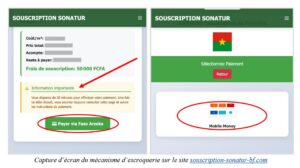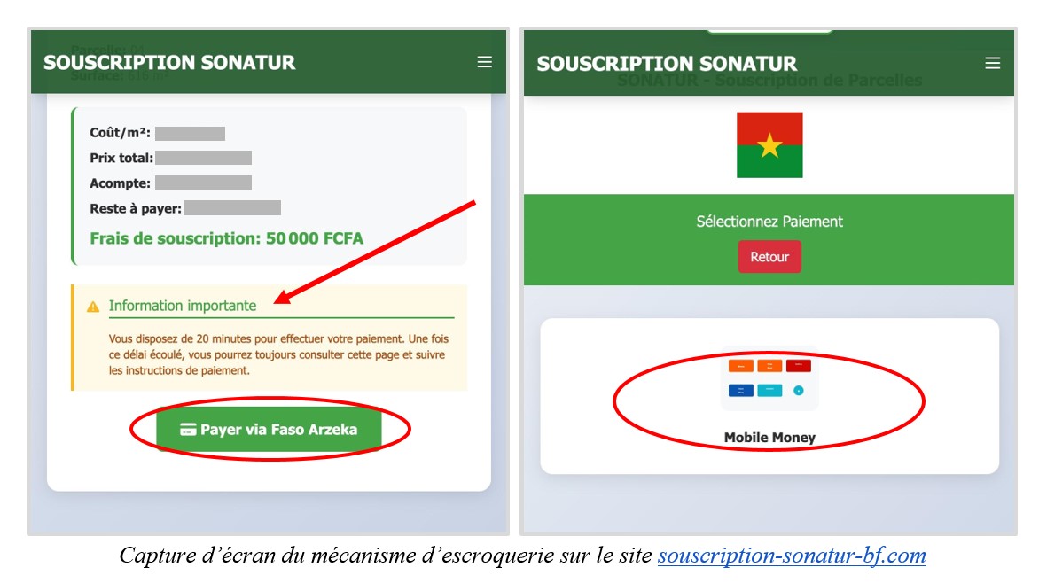 Pour pousser les internautes à vite tomber dans le piège, des expressions comme « sans files d’attente », « réservées aux premiers inscrits », sont mises en avant dans les publications. Ou bien après l’inscription, un délai est donné pour effectuer le paiement, ce message qui s’affiche sur le site souscription-sonatur-bf.com : « Vous disposez de 20 minutes pour effectuer votre paiement« .