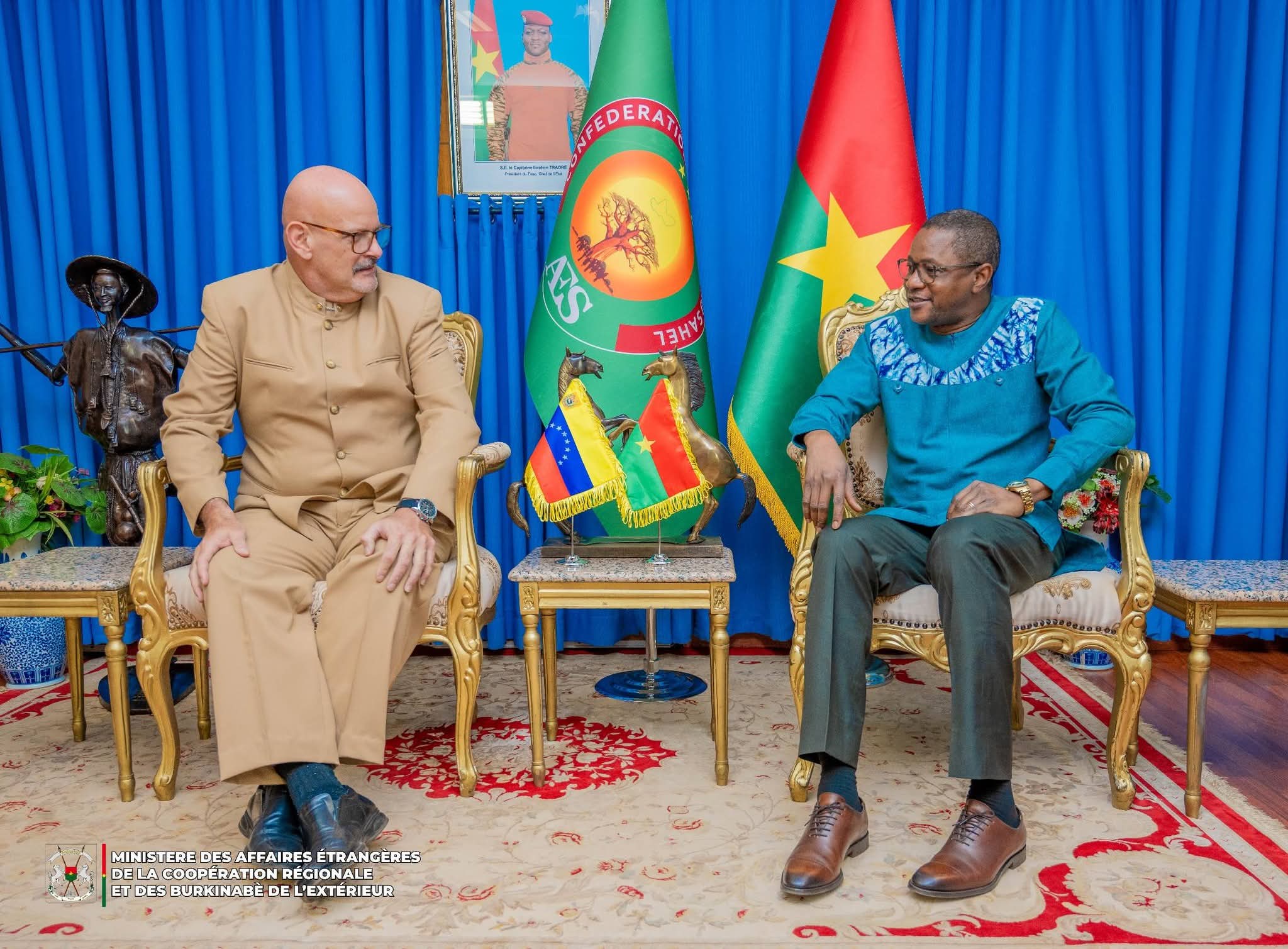 Le ministre des Affaires étrangères, de la Coopération régionale et des Burkinabè de l’Extérieur, accompagné du ministre délégué chargé de la Coopération régionale, a reçu en audience, le 7 janvier 2025 à Ouagadougou, le Chargé d’Affaires de l’ambassade de la République Bolivarienne du Venezuela au Burkina Faso.
