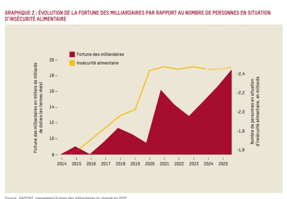 Les quatre milliardaires les plus riches d’Afrique possèdent plus de richesses que la moitié la plus pauvre de la population du continent, soit 750 millions de personnes (59,9 milliards de dollars contre 52,4 milliards de dollars), tandis que près de 59 % des Africains et Africaines, soit 892,7 millions de personnes, souffrent d’insécurité alimentaire, soit une augmentation de 29,5 % entre 2019 et 2024.