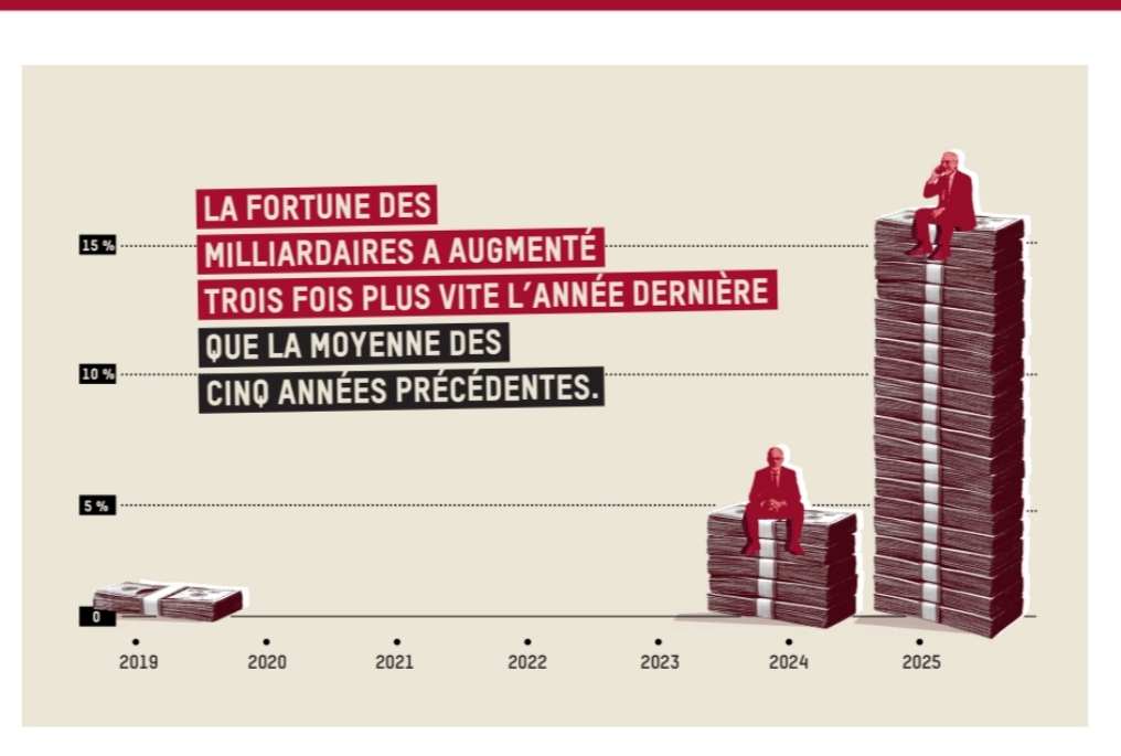 La fortune cumulée des milliardaires a bondi de 2 500 milliards de dollars l’année dernière, soit presque l’équivalent de la richesse totale détenue par la moitié la plus pauvre de l’humanité, à savoir 4,1 milliards de personnes.
