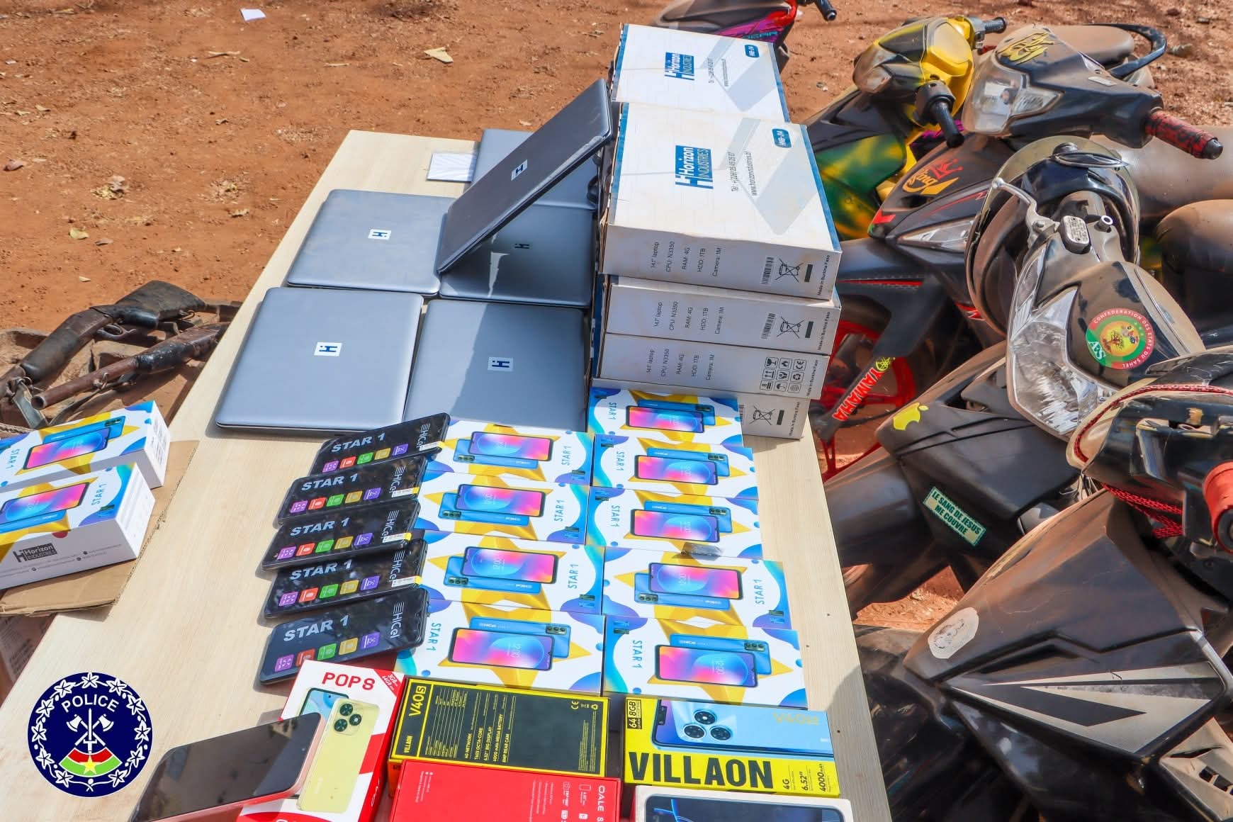 Grâce à la collaboration des populations, les enquêteurs ont appréhendé huit (08) membres actifs du gang et saisir entre leurs mains plusieurs objets dont 02 fusils de chasse de calibre 12mn, 07 motos volées et retrouvées, 46 téléphones portables neufs, 14 ordinateurs portables neufs et du numéraire.