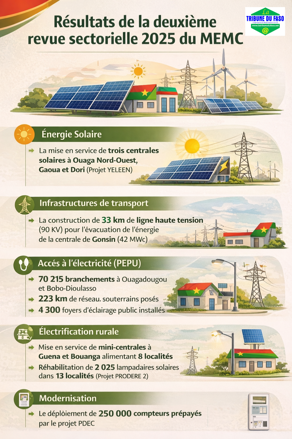 - Accès à l’électricité (PEPU) : La réalisation de 70 215 branchements à Ouagadougou et Bobo-Dioulasso, ainsi que la pose de 223 km de réseaux souterrains et l’installation de 4 300 foyers d’éclairage public.