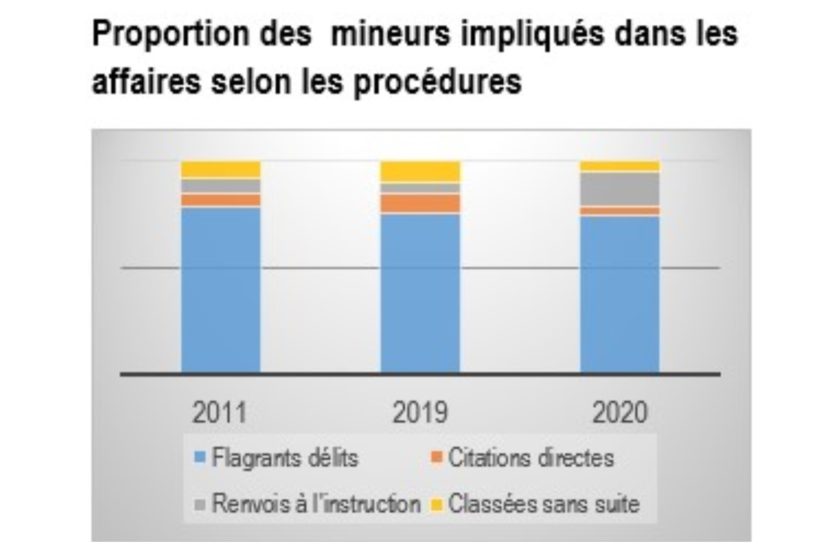 La majorité des mineurs déférés devant le parquet, le sont, pour des crimes et délits contre les biens. Sur l’ensemble des 248 mineurs, on dénombre 162 impliqués dans des affaires de crimes et délits contre les biens, soit une proportion de 65,3% en 2020. Depuis 2017, sur 10 mineurs impliqués, 9 le sont pour des cas de vols. On note également quelques mineurs impliqués dans d’autres infractions telles que les destructions et dégradations de biens, le grand banditisme, les recels et les abus de confiance. Pour ce qui est des mineurs impliqués dans les affaires de crimes et délits contre les particuliers, l’on dénombre 61 dont 16 pour vols aggravés et 15 pour viols. Le viol, les coups et blessures volontaires et les vols aggravés sont les infractions les plus récurrentes avec, en 2017-2020, 273 mineurs impliqués.