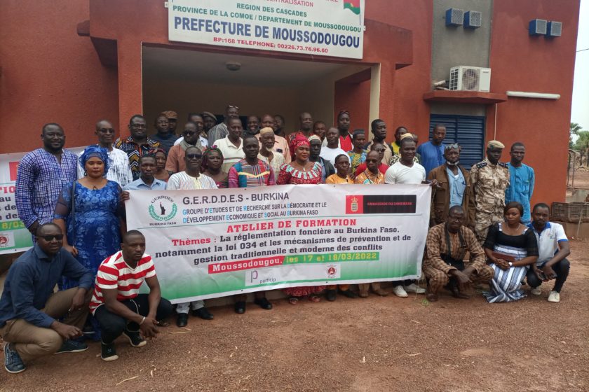 « La règlementation foncière au Burkina Faso, notamment la loi 034 et les mécanismes de prévention et de gestion traditionnelle et moderne des conflits ». C’est sous ce thème que durant 48 heures, du 17 au 18 mars 2022, des acteurs de la commune de Moussodougou, province de la Comoé, région des Cascades, ont vu leurs capacités renforcées. Cela dans le cadre du projet « Promouvoir l’esprit de paix et de cohésion sociale dans cinq (05) communes du Burkina Faso », mis en œuvre par le Groupe d’Etudes et de Recherche sur la Démocratie et le Développement Economique et Social (GERDDES-Burkina), sur financement l’ambassade royale du Danemark.