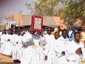 « Avec Marie notre mère, avançons au large dans l’évangélisation ». C’est sous ce thème que les fidèles catholiques du Burkina ont placé ce pèlerinage. La récitation du chapelet, la procession, la célébration eucharistique, sont là les points qui ont marqué cette grande rencontre annuelle de prière. Cette célébration eucharistique présidée par Gabriel Sayaogo, Évêque de Koupela, s’est déroulée en présence du Cardinal Philippe Ouédraogo, Archevêque métropolitain de Ouagadougou, Msgr Michaël Crotty, Nonce apostolique au Burkina et au Niger et de plusieurs autres Évêques et Prêtres venus des différents diocèses du Burkina Faso et d’ailleurs .