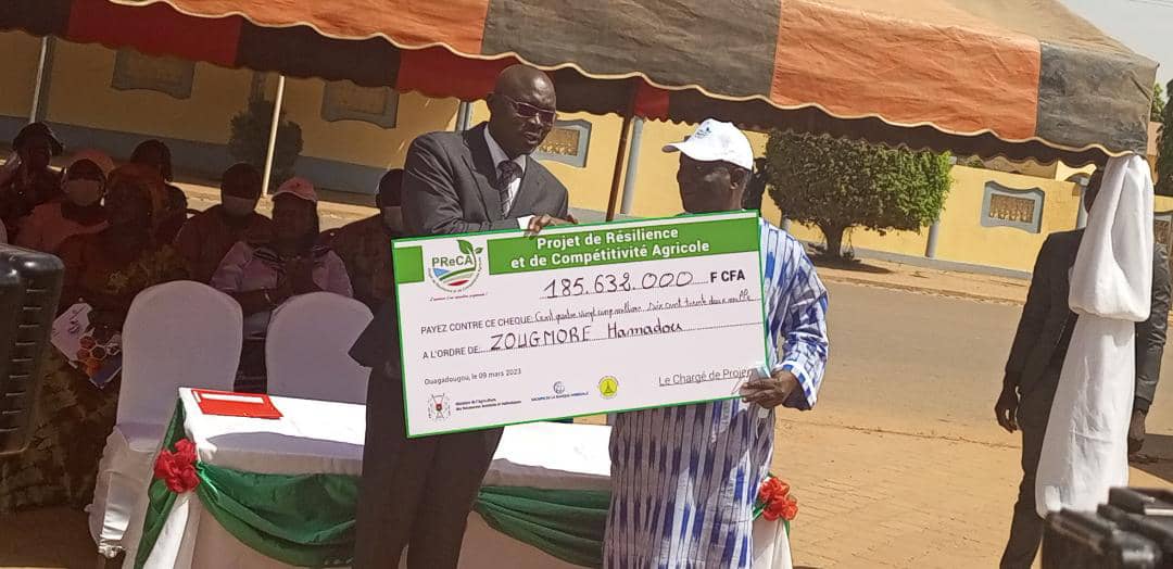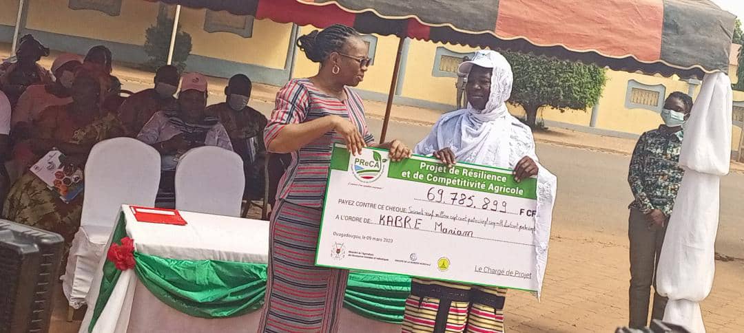 Ce jeudi 09 mars 2023 à Ouagadougou, le Projet de Résilience et de Compétitivité Agricole ( PReCA) , la maison de l’entreprise et la banque mondiale ont procédé à une signature de conventions de cofinancement suivi d’une remise de chèques aux bénéficiaires de micro projets et sous projets du secteur agricole et agroalimentaire au Burkina Faso. La cérémonie s’est déroulée autour du thème « Relever le défis du financement de l’entrepreneuriat agricole pour un secteur privé agricole et agroalimentaire résilient et plus compétitif ».