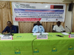 La cérémonie d’ouverture de l’atelier a été présidée par le Haut-commissaire de la province du Houet, Adama Bidiga. Tout en saluant l’initiative du GERDDES-Burkina, il a indiqué qu’elle va énormément contribuer au retour de la paix. « Les autorités administratives que nous sommes avons été instruits par le plus haut niveau pour travailler à prendre plus en charge et de gérer les conflits fonciers. L’initiative du GERDDES-Burkina va sans doute renforcer les capacités des ces structures en charge de la gestion des confits, les commissions de conciliation foncière en terme d’information pour leur permettre d’être plus opérationnelle sur le terrain et faciliter le retour de la paix», a fait remarqué le premier responsable de la province du Houet. Il a également assuré de son entière disponibilité aux côtés des initiateurs pour la réussite du projet.