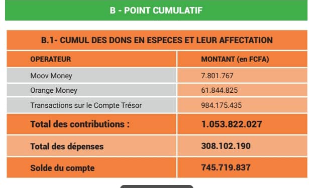 Selon ledit bilan, le cumul des dons en espèces pour le mois de juin s’élève à 126 253 004 F CFA ( Mobile money et transaction sur le compte du trésor) . Ceci fait un récapitulatif de 1 053 822 027 F CFA mobilisés, depuis le début de l’opération .De ce montant, au total 308 102 190 ont été dépensés. Cela, entre autres, dans la confection de chéquiers, l’achat de lubrifiants au profit de détachements militaires, la réparation et la militarisation des véhicules réquisitionnés dans les ministères, l’achat de carburant pour les Volontaires de défense pour la patrie (VDP).