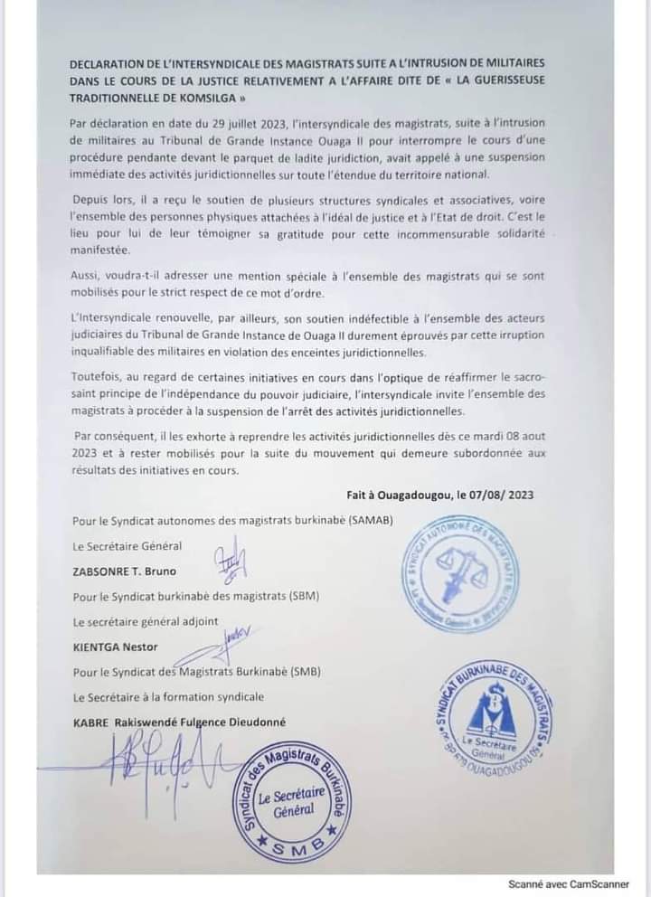 Dans une déclaration en date du 7 août 2023, l’intersyndicale des magistrats du Burkina Faso annonce la fin de la mesure de suspension des activités juridictionnelles suite à l’intrusion de militaires dans la cours de la justice relativement à l’affaire dite de « la guerrisseuse traditionnelle de Komsilga ».