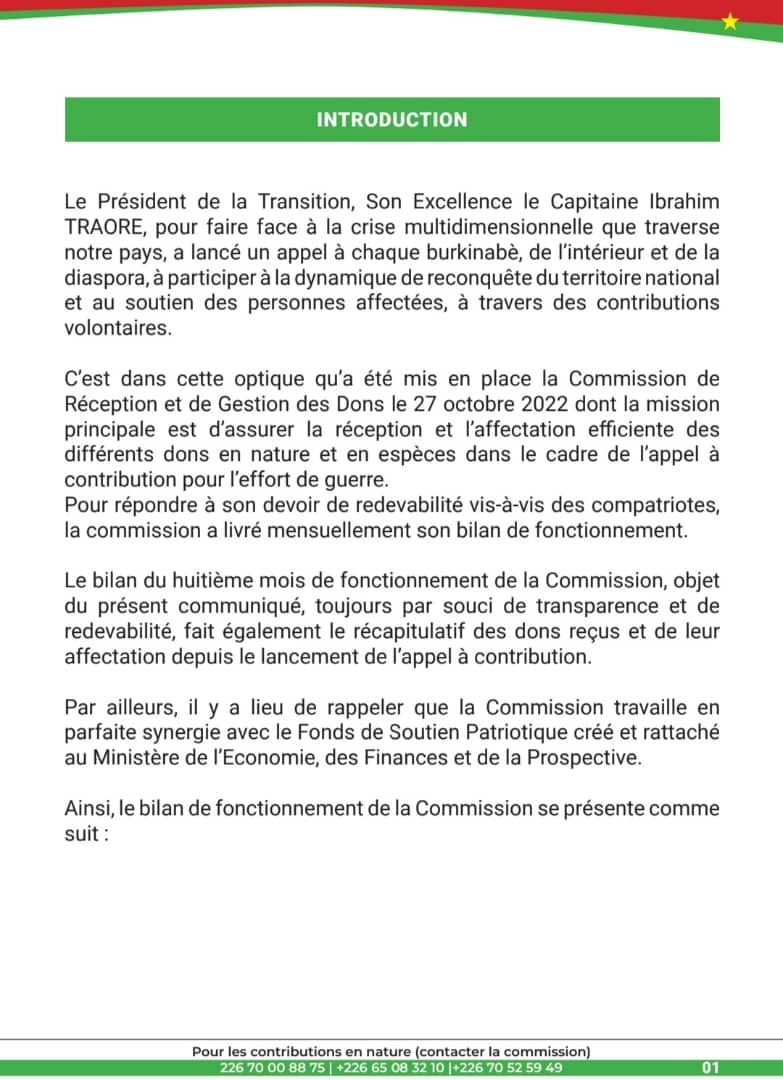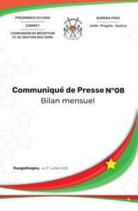 Dans un communiqué de presse en date du 27 juillet 2023, la commission de réception et de gestion des dons dans le cadre de l’appel à contribution volontaire pour la reconquête du territoire national a présenté son bilan de 8è mois.