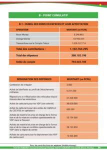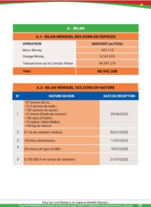 Selon ledit bilan, le cumul des dons en espèces pour le mois de juillet s’élève à 48 942 268 F CFA (Mobile money et transaction sur le compte du trésor) . Ceci fait un récapitulatif de 1 102 764 295 F CFA mobilisés, depuis le début de l’opération. De ce montant, au total 308 102 190 ont été dépensés, faisant un solde en compte de 794 662 105 F CFA.