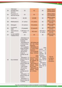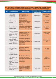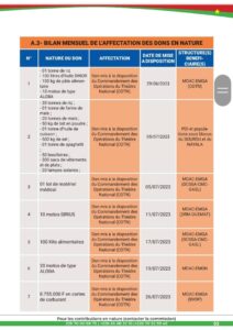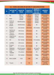 Quant aux dons en nature pour le 8è mois, il a été enregistré entre autres 7 tonnes de riz, 1,5 tonnes de maïs, 100 cartons de savons; 150 sacs d’habits, 10 radios Talkie-walkie, 20 motos, 100 kg de maïs, 1 tonne d’huile de cuisson, 100 kits alimentaires, etc.
