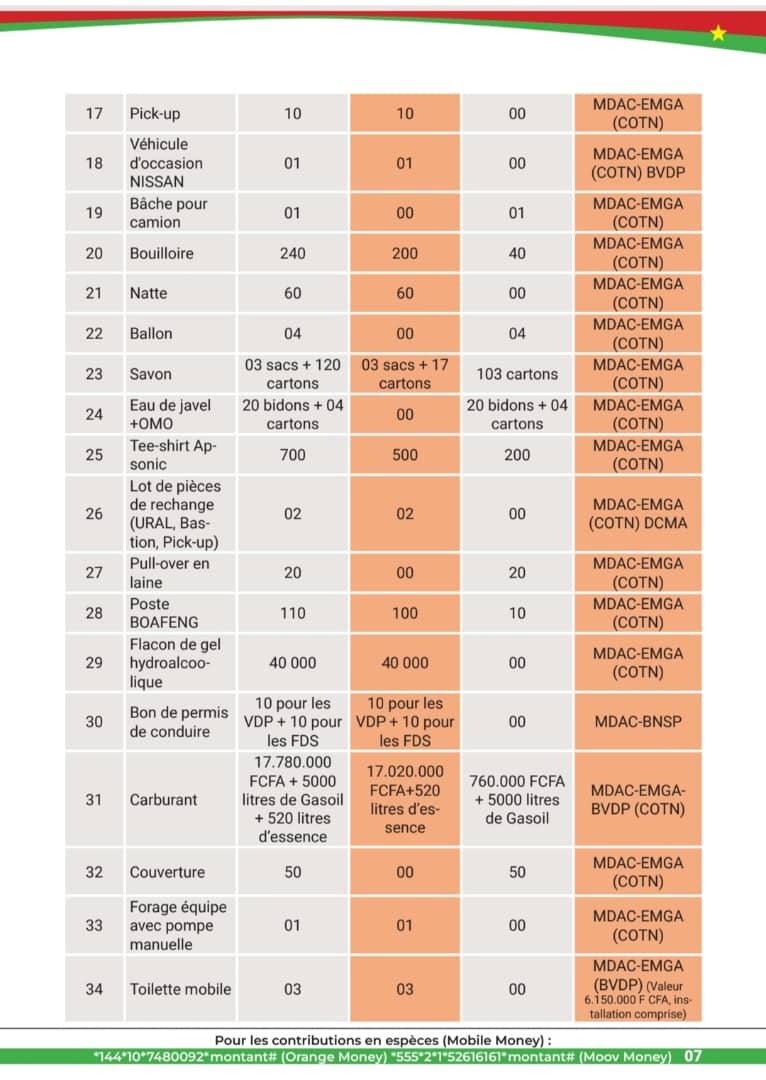 Elle rappelle par ailleurs que les contributions peuvent se faire en espèces via mobile money au *144*10*7480092*montant# (Orange Money); #144*1*3*1*22611112222*7*montant# (à partir d’un compte Orange Money Côte d’Ivoire), *555*2*1*52616161*montant# (Moov Money) ou Virement bancaire sur les comptes BF670-01001-443590001593-15; BF000-01001-000000050011-61.