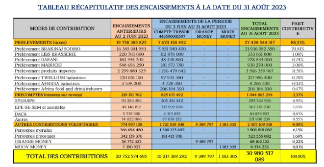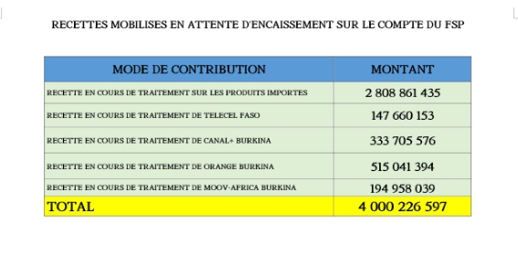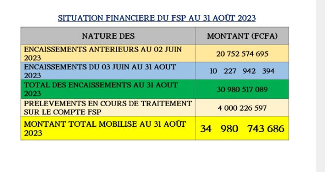 A la date du 21 août 2023, le montant des ressources mobilisées au profit du FSP est de 34 980 743 686 FCFA dont 30 980 515 089 encaissés et 4 000 226 597 en attente d’encaissement sur le compte du fonds. Ce montant représente les prélèvements effectués sur certains produits importés, les téléphonies mobiles et Canal + Burkina.
